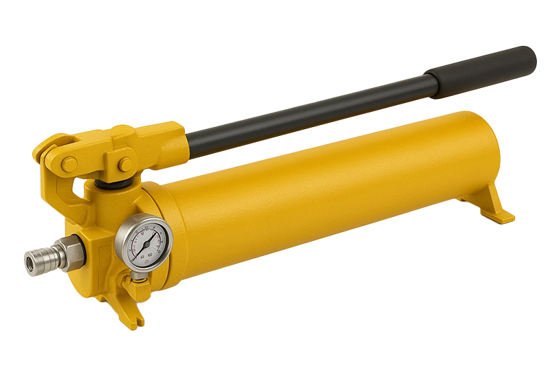 Compact steel hand pump with 700 bar max pressure, double-speed, large oil capacity, and durable chrome-plated components.